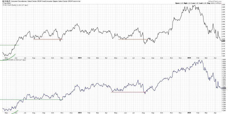 Fast-forward to February and March and you’ll see how Consumer Discretionary rotated into the Weakening and then Lagging quadrant. Meanwhile, Consumer Staples strengthened during that same period. At this point, the RRG is telling me defense over offense, in a classic bearish configuration.